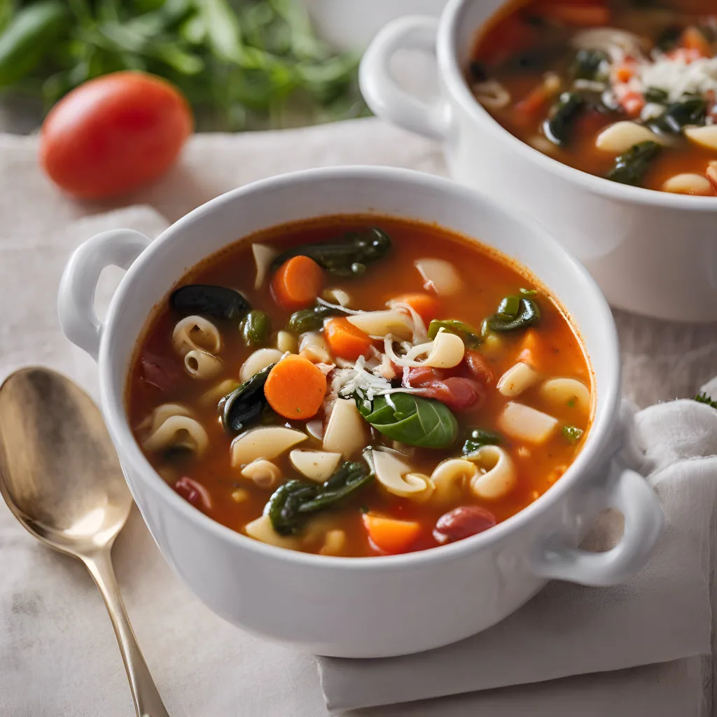 Minestrone is a hearty, nourishing Italian soup that embodies the essence of rustic, comfort food. Originating from Italy, this soup varies from region to region, featuring a rich blend of vegetables, beans, and pasta or rice, simmered in a flavorful tomato-based broth. Minestrone is a versatile dish that encourages improvisation, allowing cooks to use whatever vegetables are in season or on hand. It's a perfect way to make a warm, filling meal out of simple ingredients. Traditionally served with a sprinkle of Parmesan cheese on top, this soup is both a satisfying main course and an excellent starter. Making minestrone is straightforward, requiring basic kitchen tools and a bit of chopping.